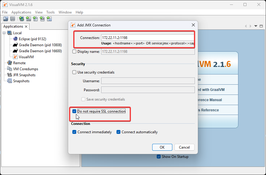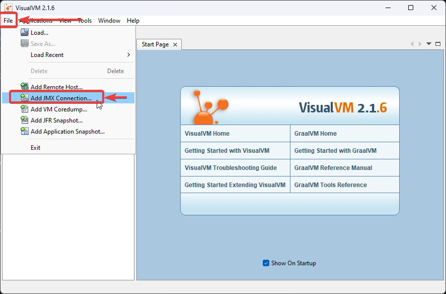 This should launch VisualVM. Once launched, open the Add JMX Connection dialog.