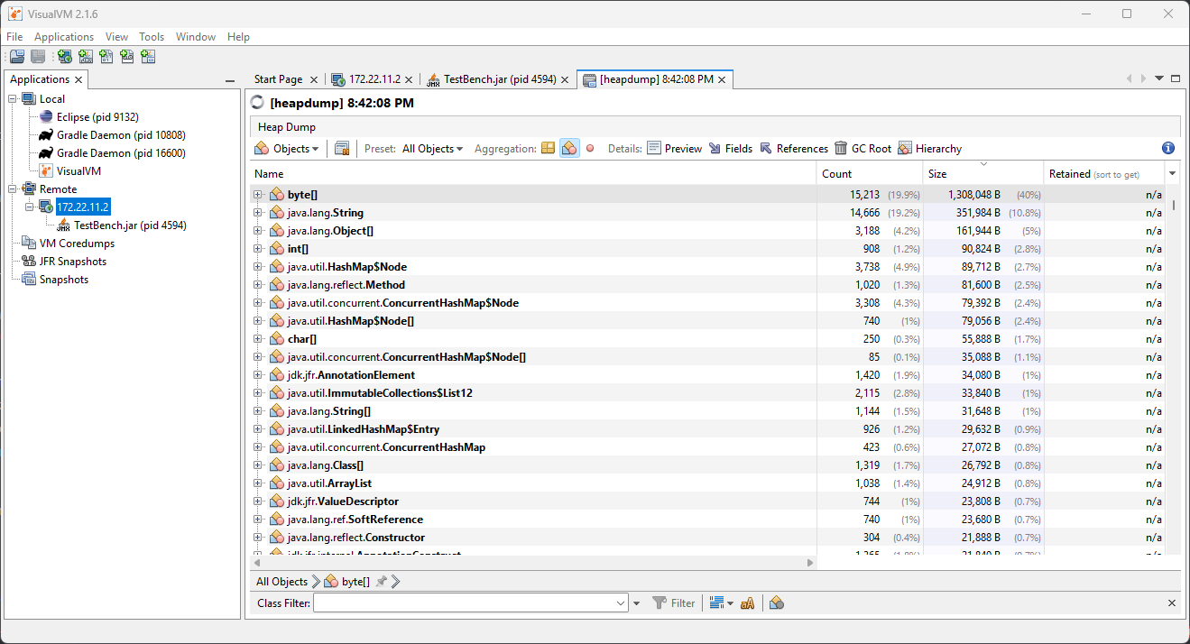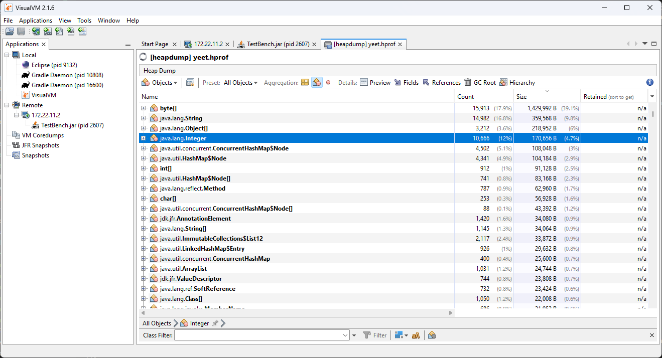 Clicking on Summary and selecting Objects instead will show a breakdown of objects by quantity. The below screenshot showcases a completely empty robot program, and then one that creates an million large ArrayList of integers.