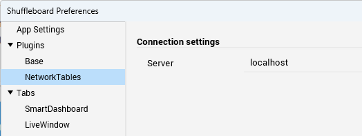 In order for Shuffleboard to be able to find your NetworkTables server on your robot, specify your team number in the “NetworkTables” tab on the Preferences pane. If you’re running Shuffleboard with a running Driver Station, the Server field will be auto-populated with the correct information. If you’re running on a computer without the Driver Station, you can manually enter your team number or the robotRIO network address.