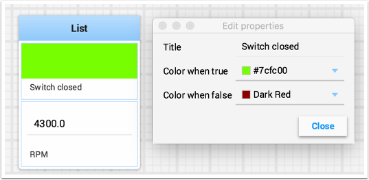 You can change the appearance of a widget such as the range of values represented, colors, or some other visual element. In cases where this is possible right-click on the widget and select “Edit properties” from the popup menu. In this boolean value widget shown below, the widget title, true color, and false color can all be edited.