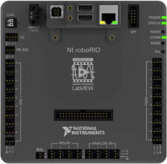 The roboRIO is a reconfigurable robotics controller that includes built-in ports for inter-integrated circuits (I2C), serial peripheral interfaces (SPI), RS232, USB, Ethernet, pulse width modulation (PWM), and relays to quickly connect the common sensors and actuators used in robotics. The controller features LEDs, buttons, an onboard accelerometer, and a custom electronics port. It has an onboard dual-core ARM real-time Cortex‑A9 processor and customizable Xilinx FPGA.