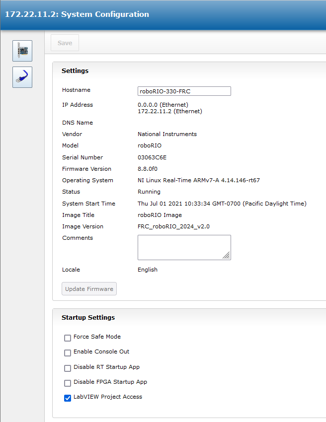 System Settings - This section contains information about the System Settings. The Hostname field should not be modified manually, instead use the roboRIO Imaging tool to set the Hostname based on your team number. This section contains information such as the device IP, firmware version and image version.